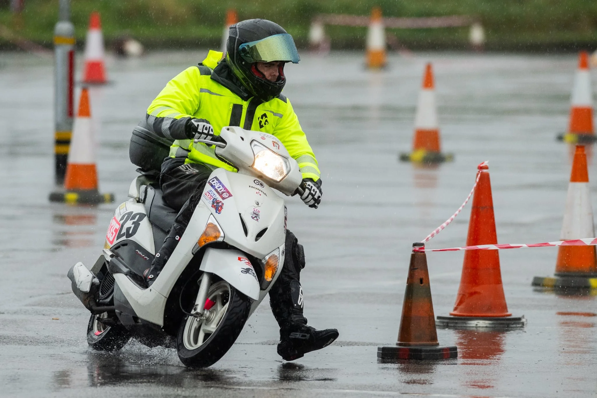 Sunday morning brought a change of scenery as the Jardin de la Mer carpark played host to the single Twisty Sprint event of the JMC&LCC calendar. The event, open to motorcycle entrants only, brings a unique challenge as competitors race against the clock around a technical course including off-camber bends and tight hairpins. The wet conditions added another level of difficulty as the grey skies and rain remained throughout the day, leaving large areas of standing water over the circuit.